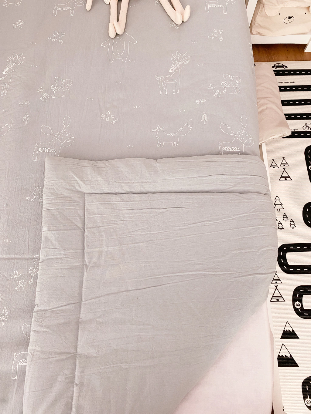 Acolchado tusor estampado en serigrafía con Animales del bosque y fondo celeste. Reverso tusor liso del mismo tono.