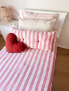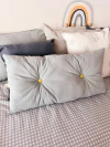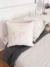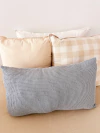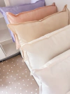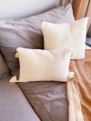 Almohadón en tela tusor crudo, detalle en el centro en tela de color y flecos de hilo.