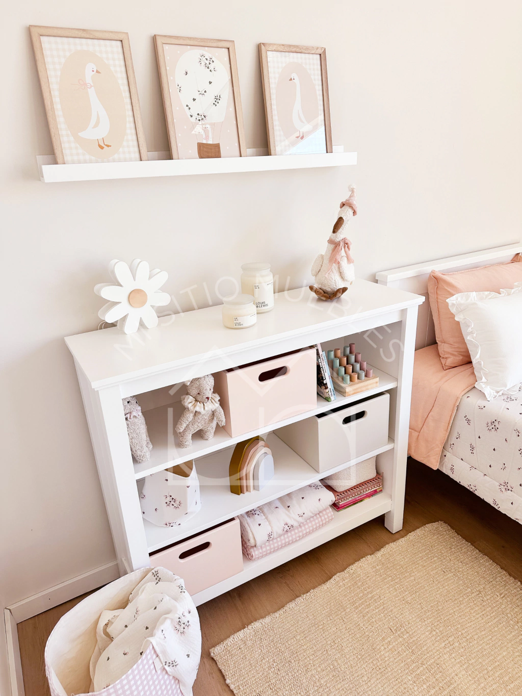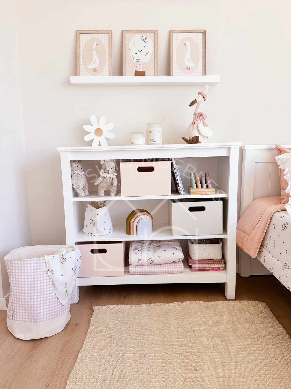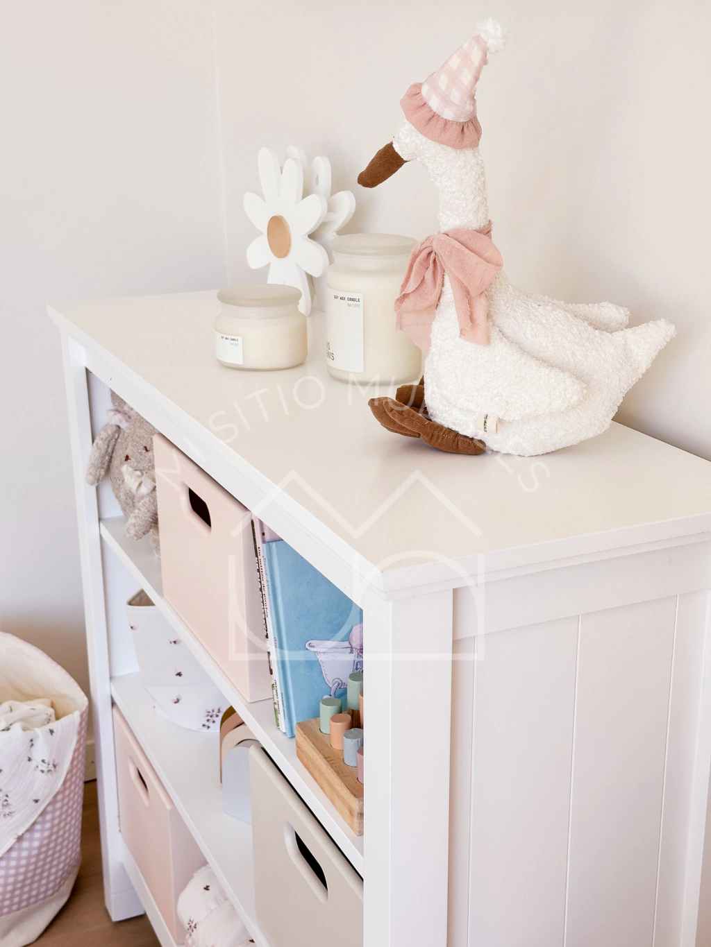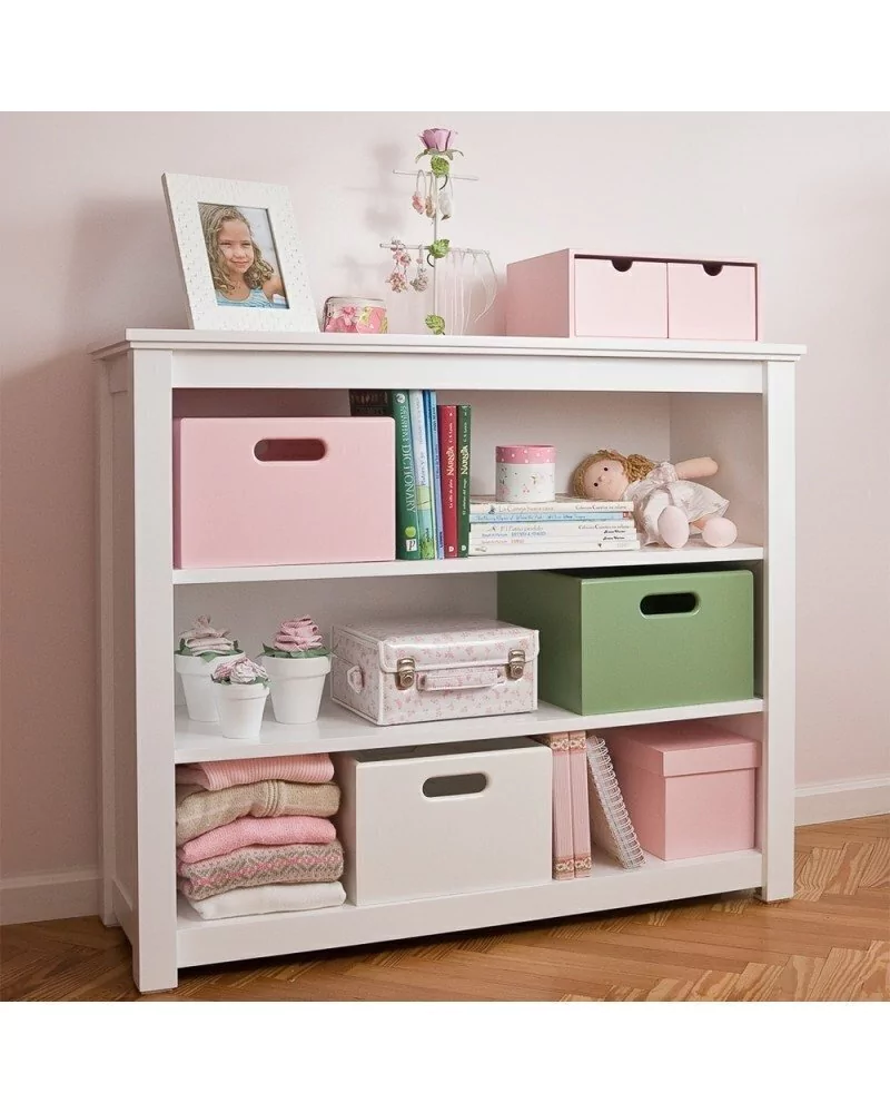 Tiene gran capacidad para libros, pero además es ideal para guardar cajas/bolsas con juguetes a las que los chicos puedan acceder fácilmente. Su diseño acompaña cualquier tipo de decoración.