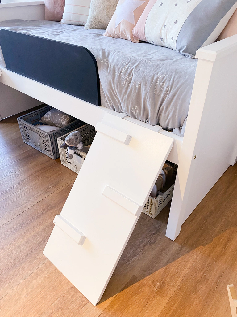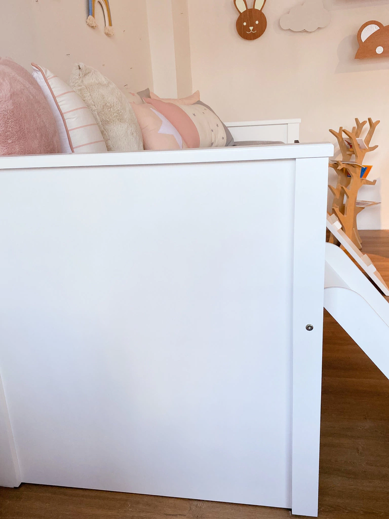 La cama Cata con tobogán y escalera, es una cama pensada para los mas chicos al estar elevada genera lugar para guardado o juego. Realizada en MDF laqueado