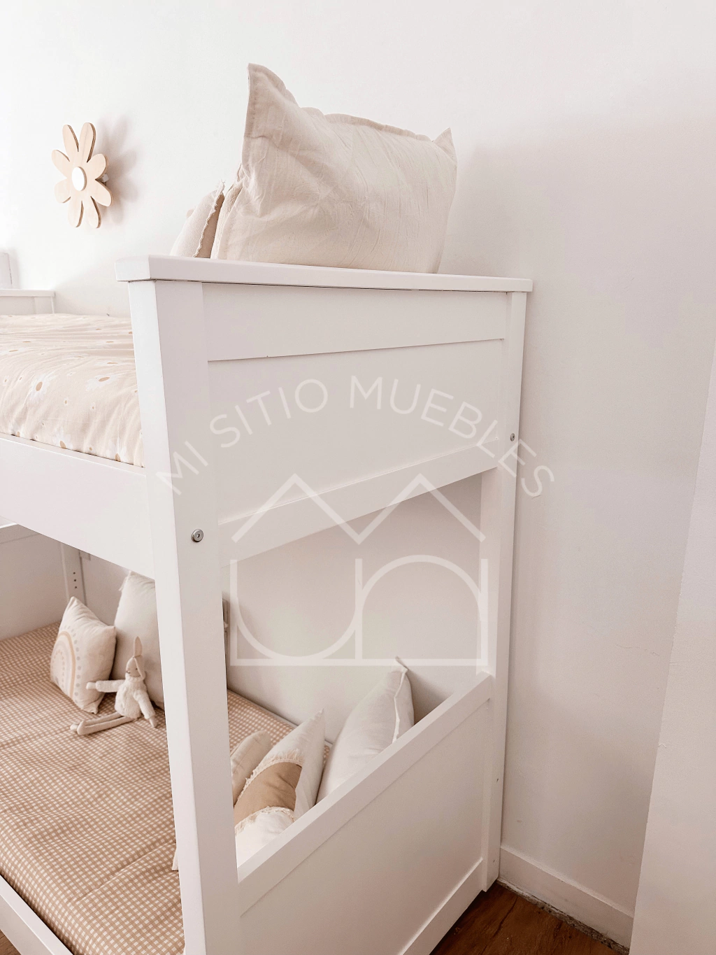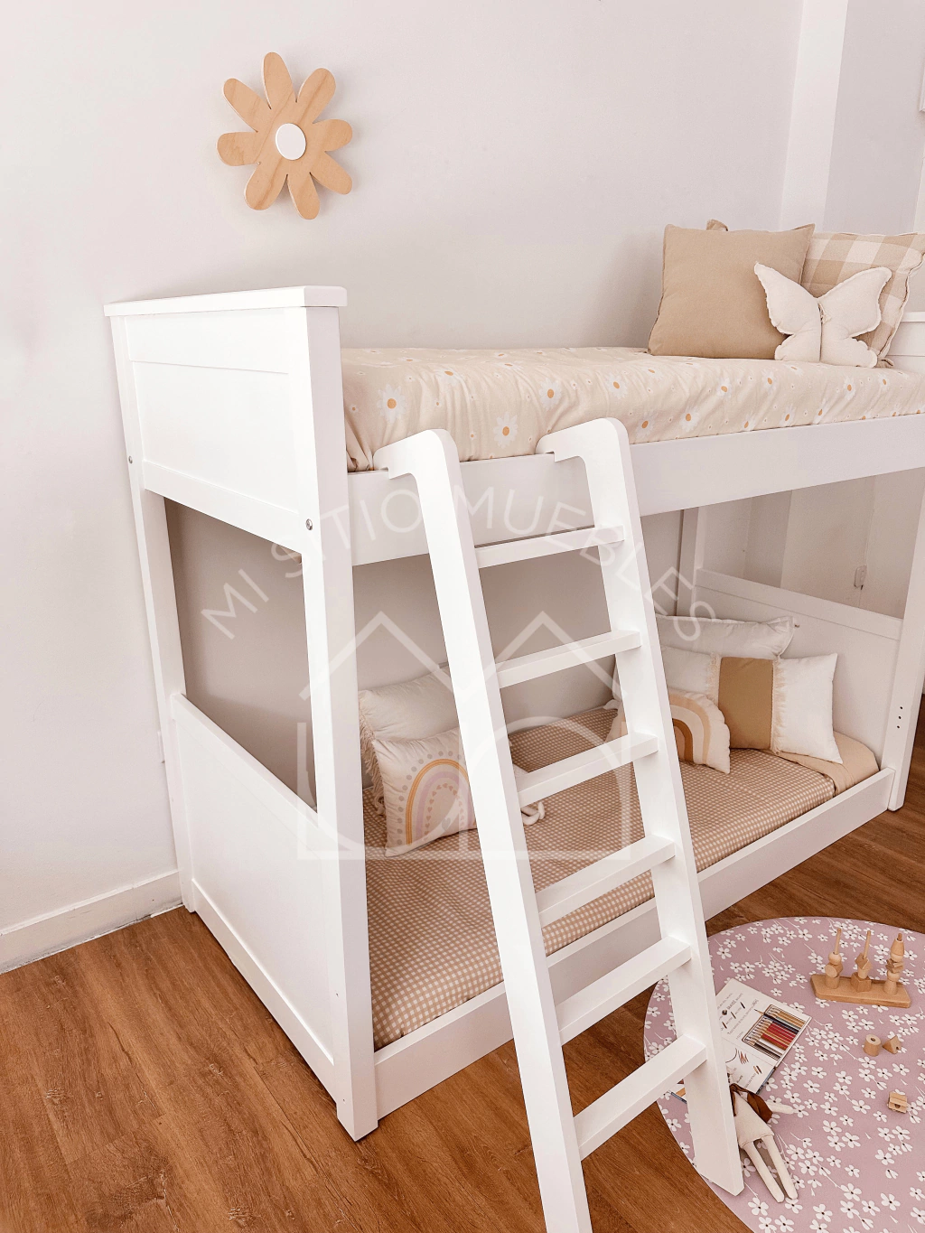 La cucheta Cata Montessori se basa en la idea de que nuestros hijos se encuentren al raz del suelo para que puedan moverse, crecer y aprender de forma autónoma. Incluye escalera que se atornilla en cualquiera de sus cabeceras y baranda para cama superior.