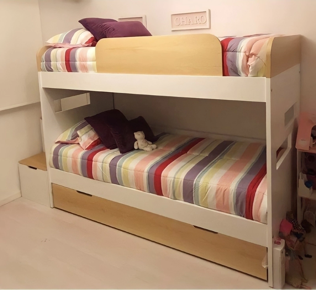 La cucheta paralela Milo es una de las mas elegidas a la hora de definir una habitacion estilo nordico. El modelo puede ser combinado o todo en blanco. Si se quiere se le puede adicionar una cama inferior para invitado y la escalera con cajones para maximizar el espacio de guardado.