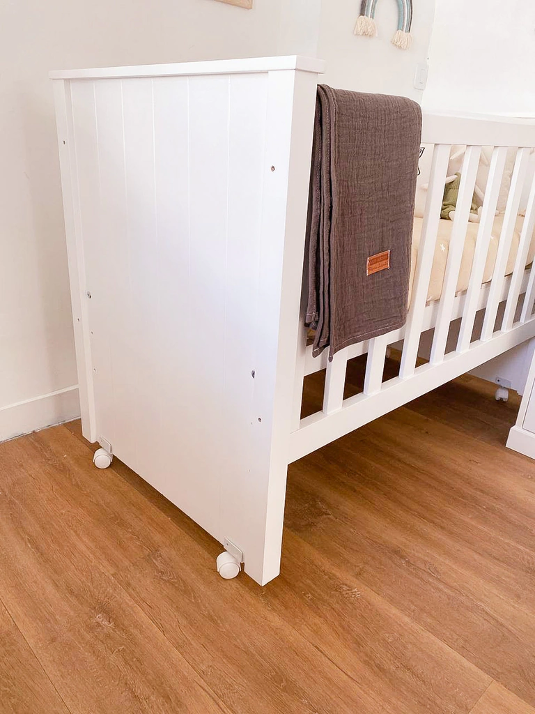 La cuna Luli permite tres posiciones de colchón. La parrilla es regulable en 3 alturas, de acuerdo a los meses del bebe. Sus cuatro ruedas permiten el fácil desplazamiento. Está diseñada para un colchón de 60x120 cm.