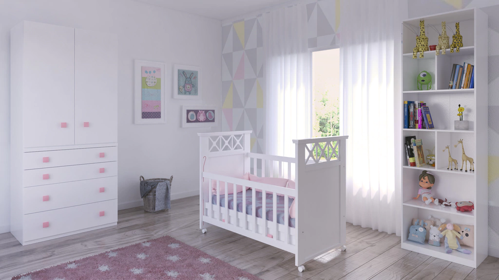 Cuna charriot para colchon de 1.20 x 0.60m. Con baranda deslizable, unica posicion de colchon. Posee rueditas, y un cajon inferior.