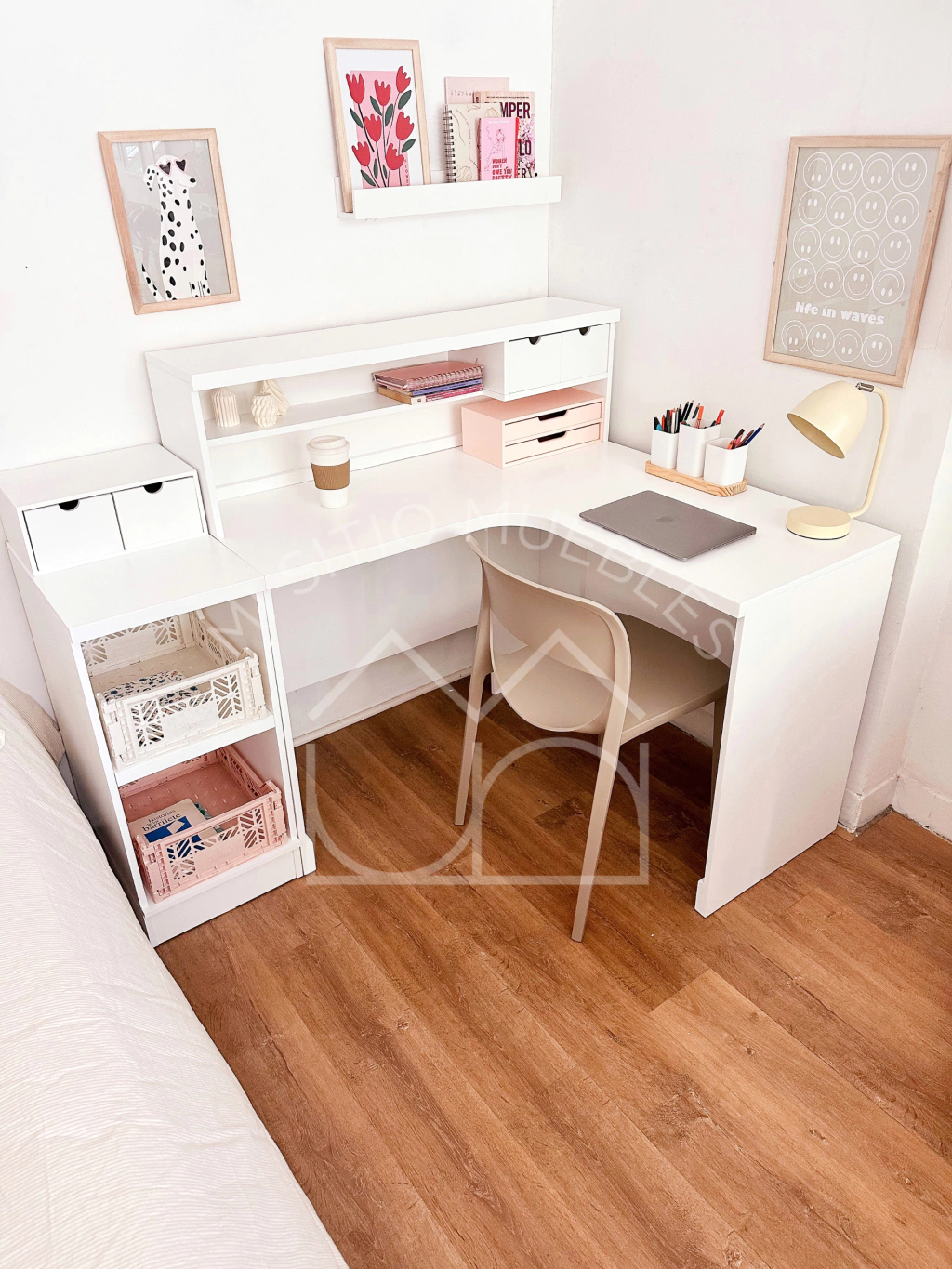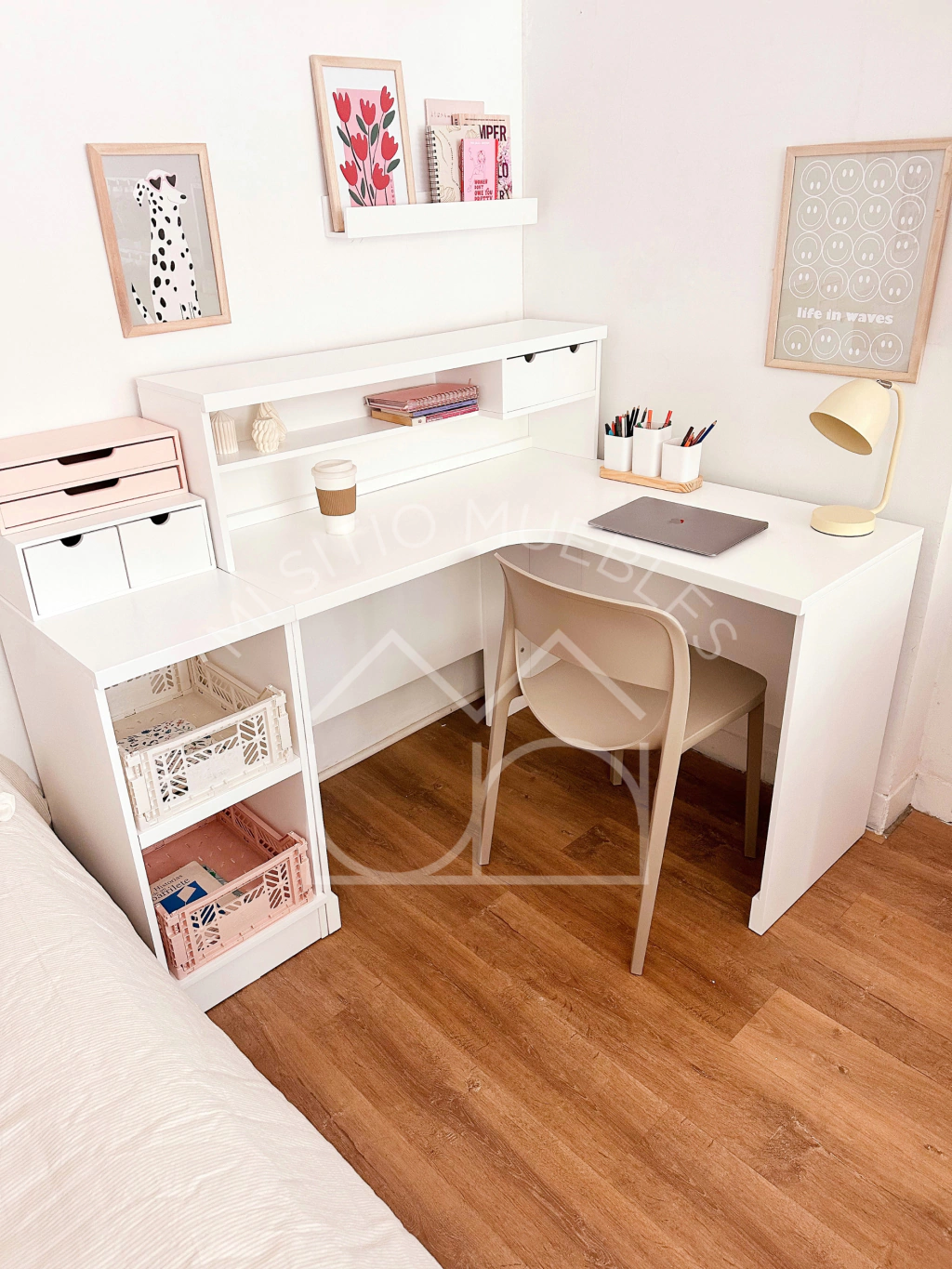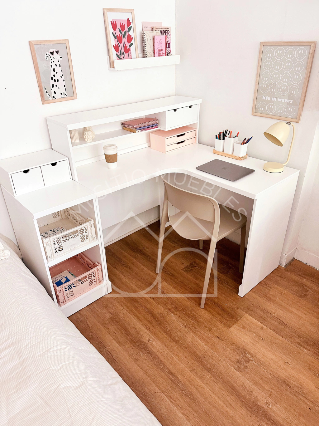 El escritorio esquinero es ideal cuando se requiere mayor espacio de trabajo. Completa la línea modular y se complementa con los módulos y cama.