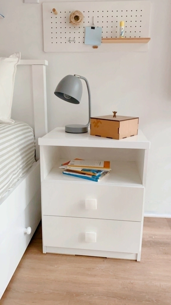 Mesa de luz India con 2 cajones y nicho de gurdado. Con su diseño de lineas rectas hecha en melamina