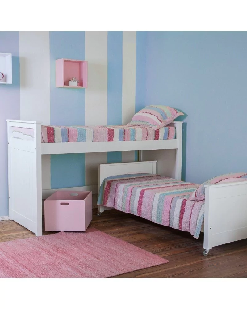 Puede usarse como nido convencional o disponerla en L. Sus líneas rectas y sobrias la hacen adecuada tanto para nenas como para varones. Tiene dos ruedas giratorias en la parte delantera para facilitar el movimiento. Al disponerla en forma de "L", se libera el espacio central de la habitación y puede aprovecharse el espacio libre bajo la cama superior para colocar un mueble de guardado. Además, en esa disposición, es compatible con una cama inferior, posibilitando el uso eventual para 3 niños. Viene para colchones de 80x190cm (una plaza) o para colchones de 90x190cm (plaza y media).