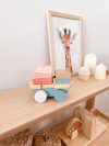 La torre de encastre viene en dos tonos distintos: fuertes o pasteles. Tiene 12 maderas en distintos tamaños para jugar!